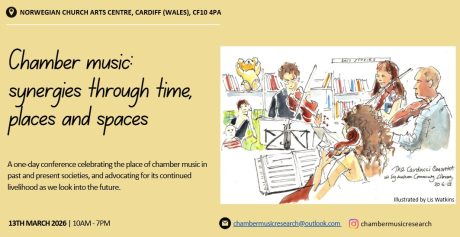 The event, which is free to attend, will be held at the Norwegian Church Arts Centre (Cardiff Bay) on the 13th of March from 10am – 7pm. To open the conference, Prof. Lucy Green, Dr Susan Young, Julia Plaut and Clíona Ní Choileáin will be joining us for a Panel Discussion on Music Education & Engagement through Chamber Music. During the day scholars and researchers from around the UK, Europe and the USA will be presenting on a wide range of historical, interdisciplinary and practice-as-research chamber music topics. This will be followed by a performance of Mendelssohn’s Octet, performed by the Carducci and Vita Quartets. Concluding the conference, Prof. Laura Tunbridge will be presenting a Keynote Lecture on ‘Do we need to have a conversation about this? “Playing Chamber” in the twenty-first century’.