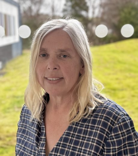 Rachael Perrin smiling at the camera. She has short brown hair and glasses, and a patterned top.Rachael Perrin