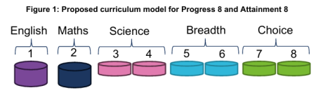 Chapter 1, titled Improving Progress 8 and Attainment 8 Measures, sets out proposals to refresh the Progress 8 model. You will encounter mention of ‘buckets’ and ‘slots’; these are where subjects have been grouped together into compulsory and optional choices. The reason it is called Progress 8 is that there are 8 slots, as numbered in the image below.
